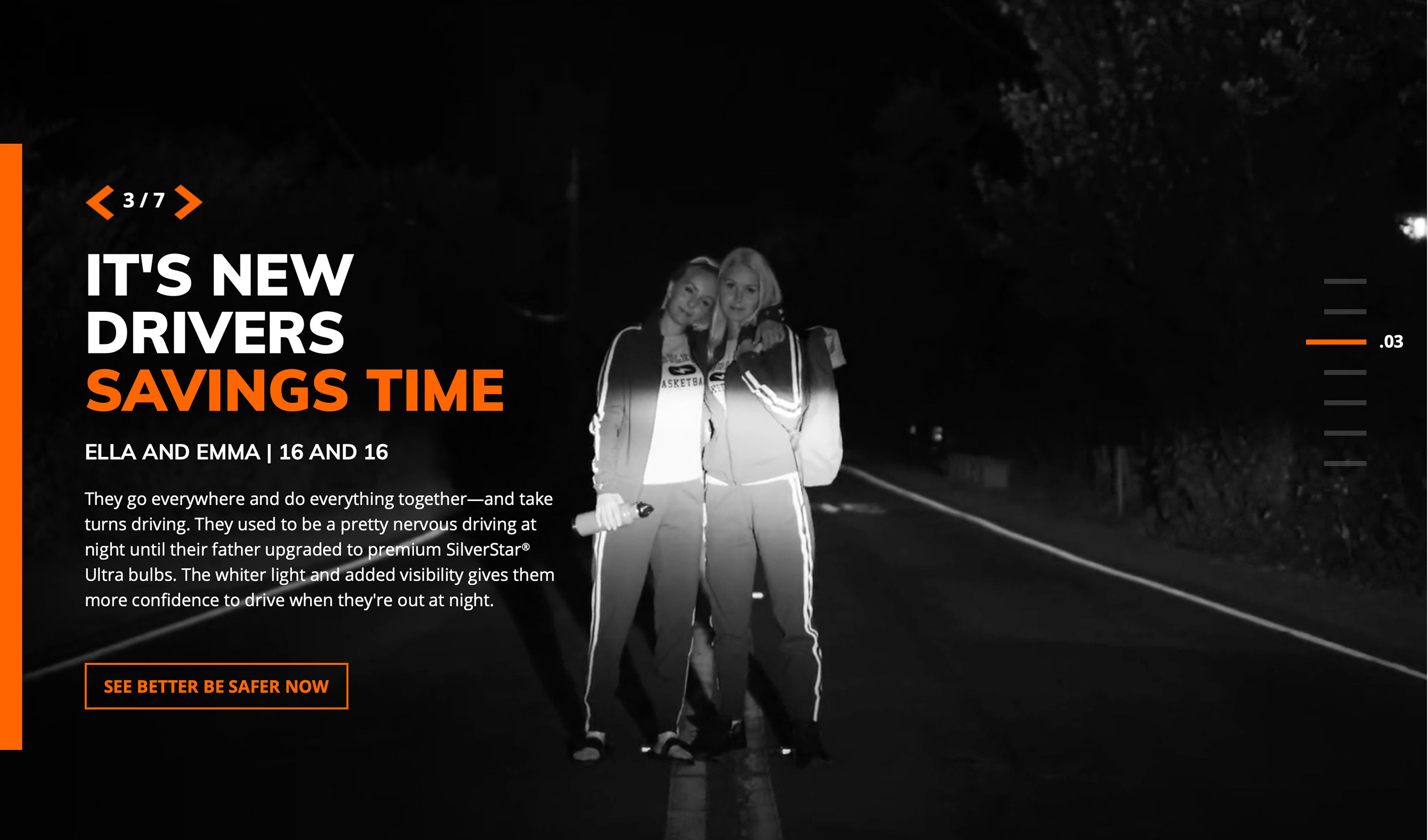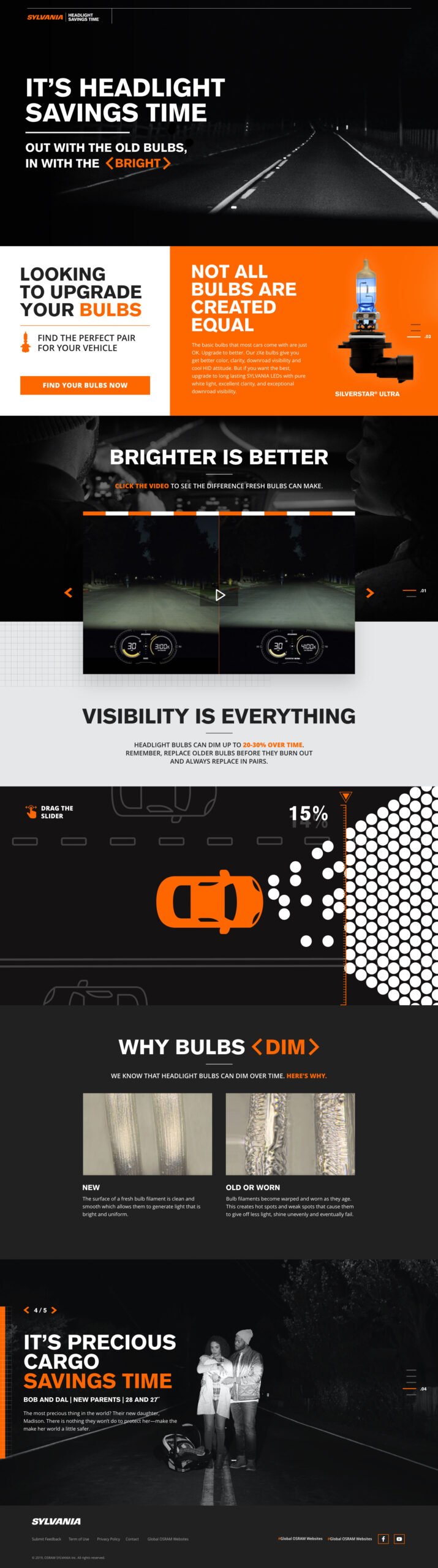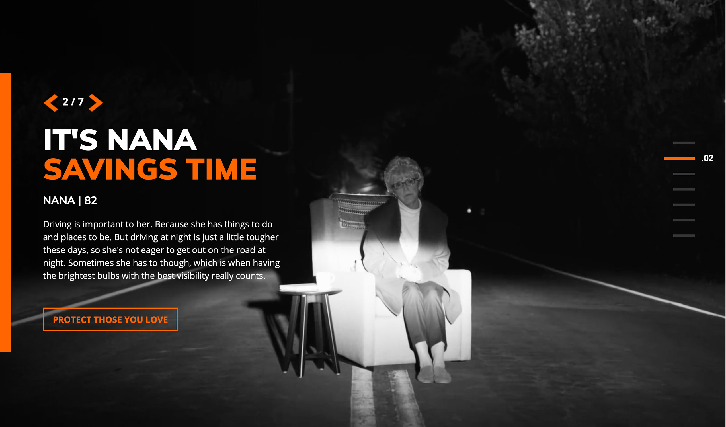 They make some of the highest quality automotive lighting products on earth. And totally dominate the category. 92% market share in the US and 80% in Canada. Increasing market share wasn’t our biggest challenge. Getting people to do something they never ever do—think about headlights—that was the challenge. We needed to turn indifference into awareness. Teach people how to achieve even greater clarity and down road visibility by upgrading their older, dimmer bulbs to fresh, brighter ones. And Think Farther Down the Road.